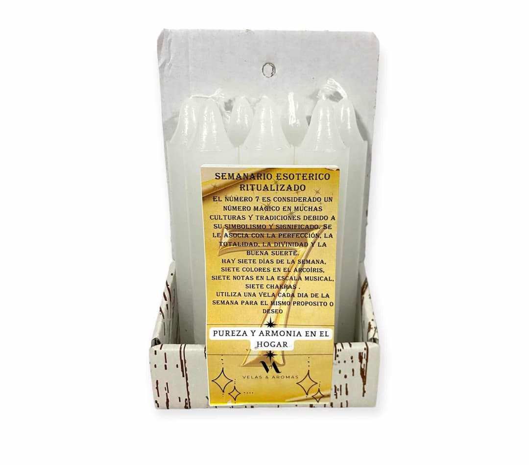 Transforma cada día de la semana con nuestro Semanario Esotérico en color blanco, diseñado especialmente para purificar y armonizar tu entorno. Cada vela de este conjunto representa un día específico, ofreciéndote una experiencia única de bienestar y equilibrio. Con aromas frescos y limpios, estas velas están hechas para infundir paz y serenidad en tu hogar. Utilízalas para iniciar meditaciones, rituales de sanación o simplemente para crear un ambiente relajante tras un día agitado. Fabricadas artesanalmente en España con ceras de la más alta calidad, cada vela garantiza una combustión limpia y duradera, libre de componentes tóxicos.