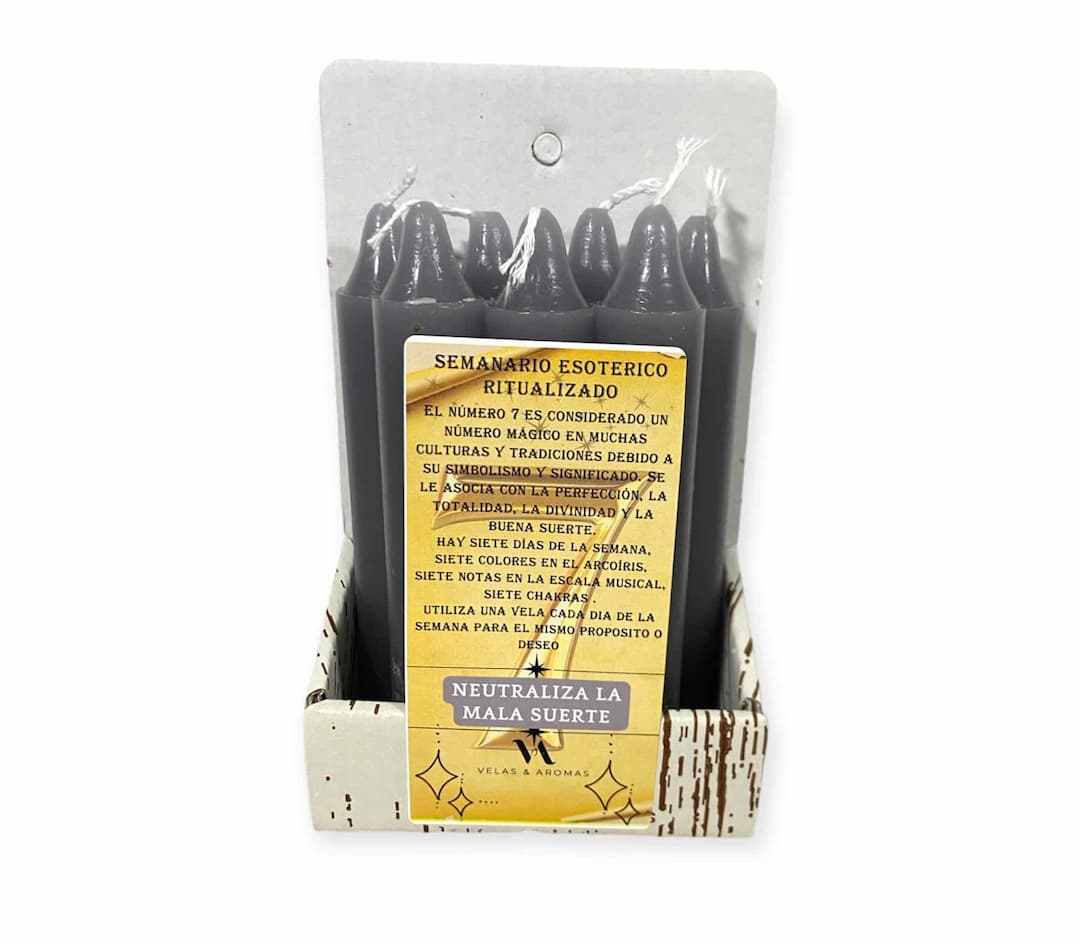 Transforma tu ambiente y fortalece tus defensas espirituales con el Semanario Esotérico Gris, un conjunto de siete velas, una para cada día de la semana, diseñadas para combatir la mala suerte y fomentar la estabilidad. Cada vela de este set ha sido meticulosamente elaborada a mano con los mejores ingredientes naturales, seleccionados por sus propiedades para neutralizar energías negativas y promover la tranquilidad.