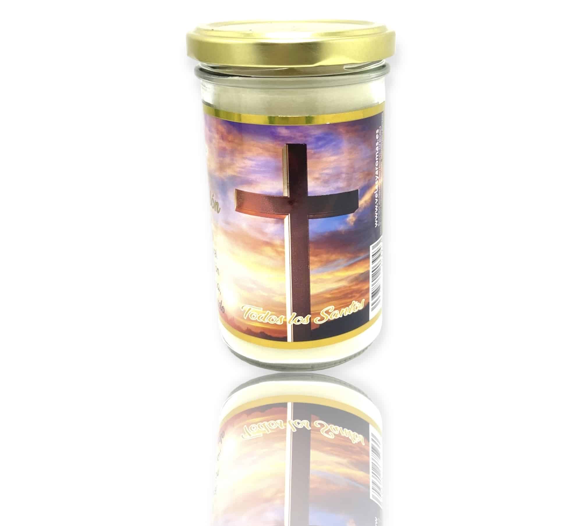 Enciende una vela de todos los Santos ecológica de cera natural en tarro de cristal y siente la paz y protección de todos los santos mientras realizas tus oraciones. Cada vela es una muestra de devoción y amor a nuestros santos, y con su llama iluminarás tus plegarias y peticiones. Presentada en tarro de cristal que es reutilizable ya que no deja ningún resto al consumirse.
