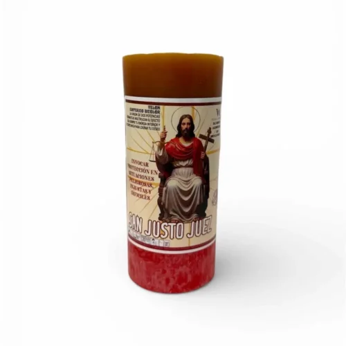 Este velón bicolor San Justo Juez, fabricado en España, tiene unas medidas de 6 cm de ancho por 14 cm de alto, ideal para trabajos espirituales de petición, justicia y protección.